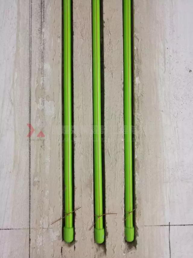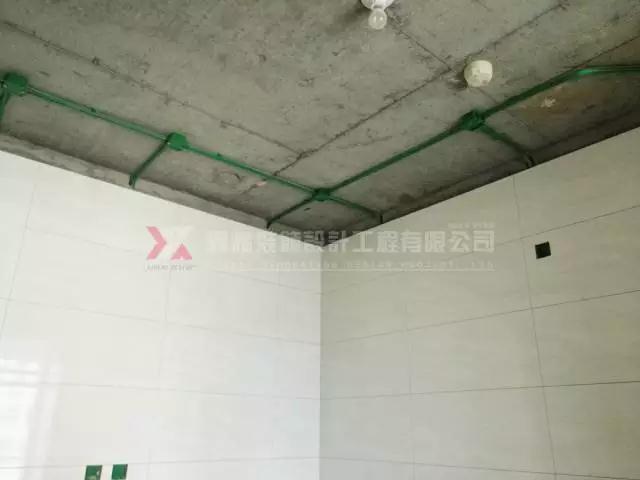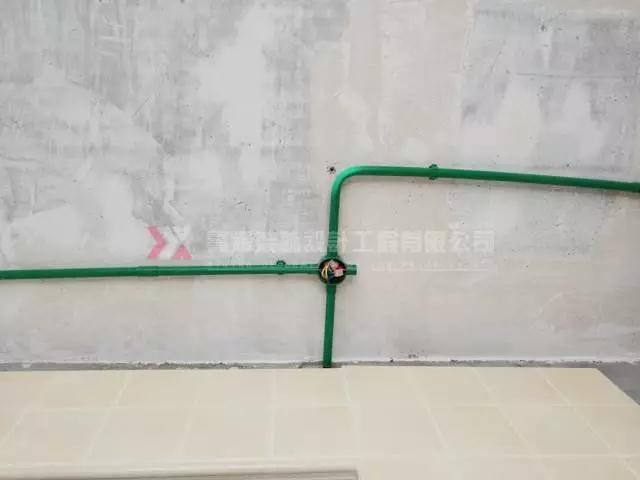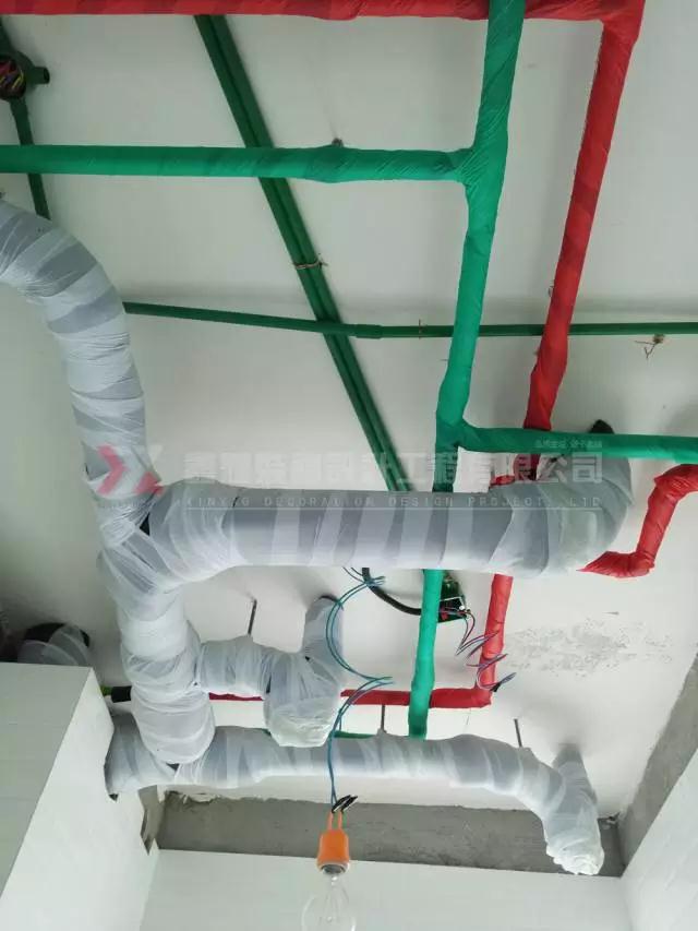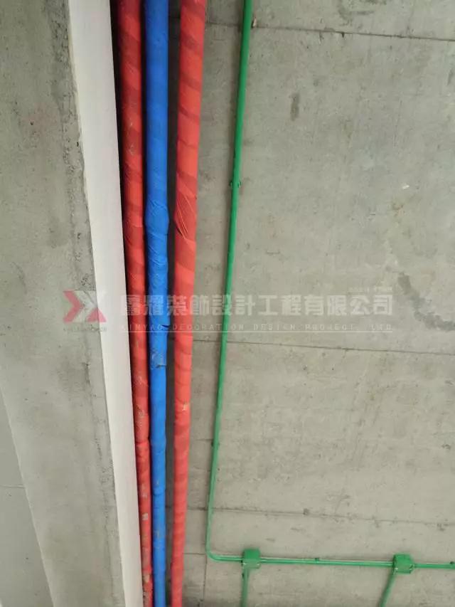 開槽布線垂直、清晰規范;水路改造上熱下冷,紅色管紅色綁帶,冷水管綠色綁帶;熔前管外套聚丙烯隔音棉做隔音處理...